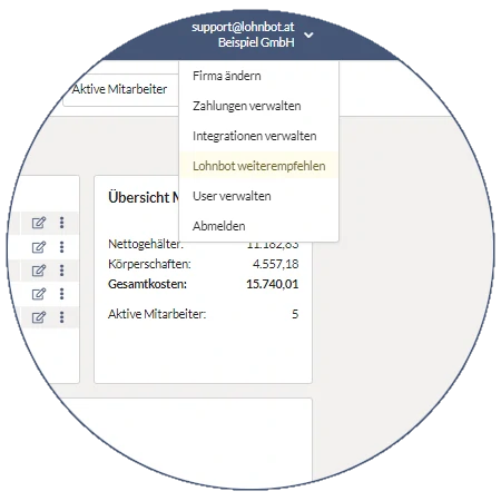 Einzige Voraussetzung für eine Teilnahme an unserer Prämienaktion ist, dass Sie bereits einen Lohnbot Account haben. Wenn Sie diese erfüllen, finden Sie in Ihrer Lohnbot App, im Dropdown-Menü rechts im Header, die Option ''Lohnbot weiterempfehlen''.